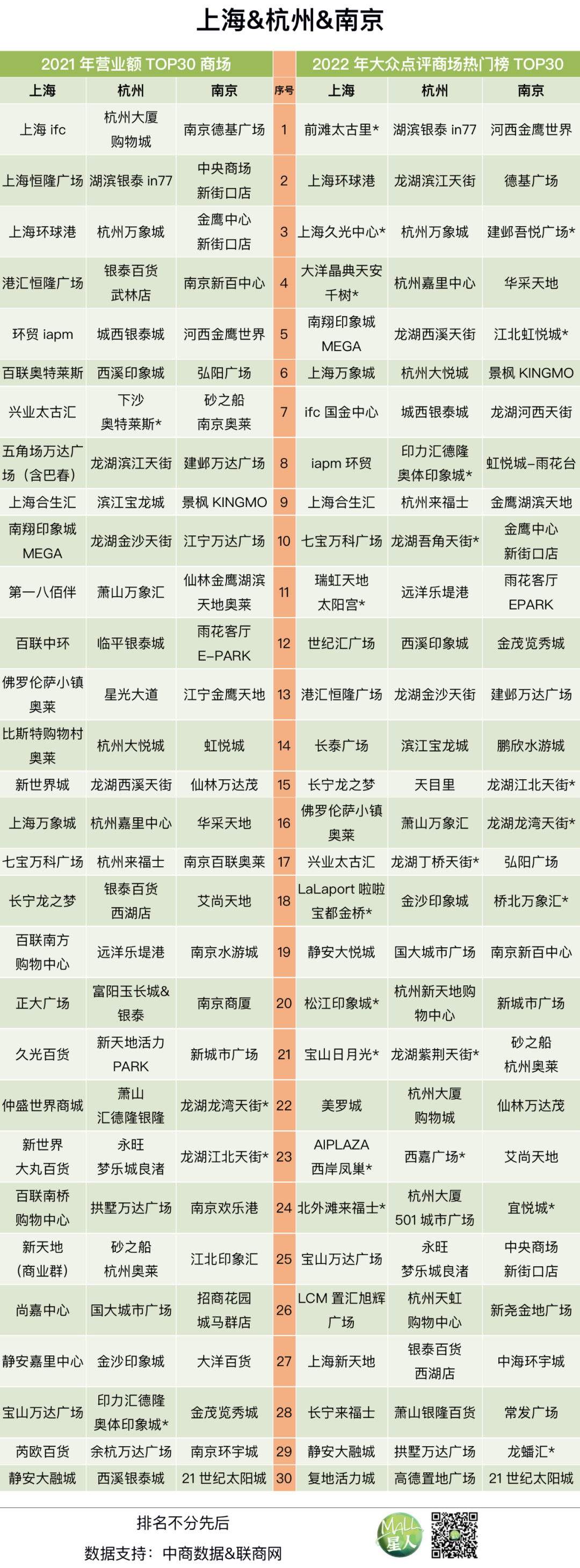 【TIPS】標*的為2021年新開項目(新開項目在熱門度方面往往具有更大優(yōu)勢)。大眾點評每天的點評名次會有變動,以上2022年大眾點評商場熱門榜TOP30根據(jù)2022年6月上旬數(shù)據(jù)綜合而成,上海項目名次與封控后復(fù)工先后有關(guān)。另外,由于項目體量和營業(yè)額統(tǒng)計口徑不盡相同,因此并未按照營業(yè)額高低排序。去一個城市考察,不可能把這些項目都看遍,所以我們希望和大家一起,群策群力,從中選出在有限的時間安排內(nèi),杭州與南京各自最優(yōu)先值得考察的10個項目。