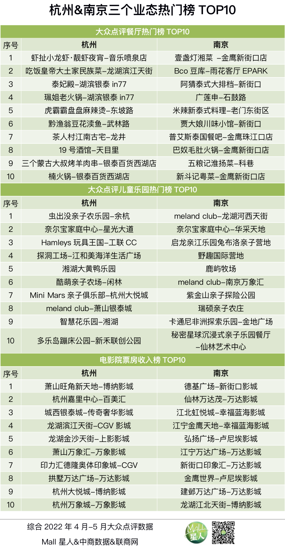 Mall星人選取餐飲(考察的同時也要解饞,一飽口福也是人生美事,有更好吃的歡迎推薦)、兒童樂園(考察的同時順帶跟孩子一起玩下)和影院三個業(yè)態(tài),整理出了杭州和南京這三個業(yè)態(tài)各自的熱門榜TOP10及對應(yīng)項目。