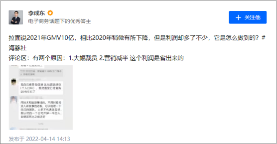 當(dāng)然,以上數(shù)據(jù)并非來(lái)自經(jīng)過(guò)審計(jì)的財(cái)報(bào),真實(shí)性存疑。比如在2022年4月,海豚社創(chuàng)始人李成東就在知乎上表示,拉面說(shuō)2021年GMV達(dá)到10億,相比2020年稍微有所下降。