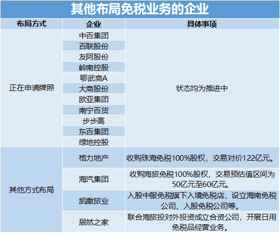 除此之外,當下,還有包括中百集團、嶺南控股、格力地產(chǎn)、海汽集團、凱撒旅業(yè)等多家企業(yè)試圖發(fā)力免稅業(yè)務。