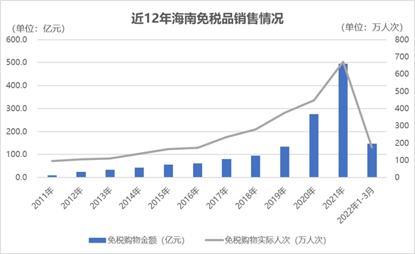 從數(shù)據(jù)上看,離島免稅政策每一次調(diào)整都給免稅購物銷售額帶來新一輪的漲幅。數(shù)據(jù)顯示,從2011年到2021年,海南離島免稅年銷售額從9.8億元穩(wěn)步增長至494.7億元。
