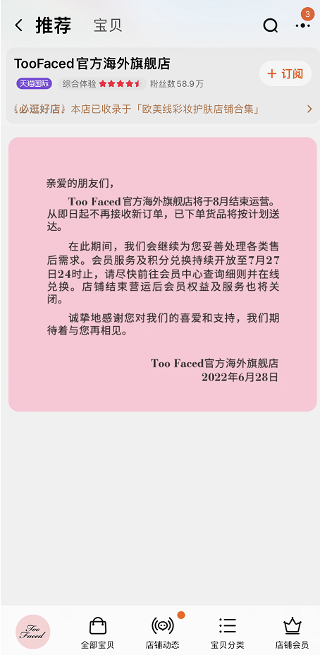 6月28日,天貓國際Too Faced官方海外旗艦店內(nèi)發(fā)布一則公告稱:店鋪將于8月結(jié)束運營,即日起不再接收新訂單,已下單的貨品將按計劃送達。會員服務(wù)和積分兌換將持續(xù)開放至7月27日。店鋪結(jié)束運營后,會員權(quán)益及服務(wù)也將關(guān)閉。