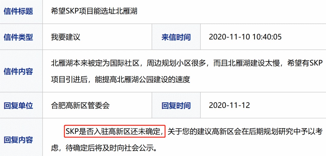 關(guān)于該消息的最新官方消息是2021年3月。當(dāng)時有網(wǎng)友咨詢“政務(wù)區(qū)紅四方地塊治理需要多久?希望引入SKP”,回復(fù)的內(nèi)容稱,目前需對地下水進行長期監(jiān)測,需一年半時間,且針對來信人提出希望引入skp,街道將呈報給有關(guān)部門。