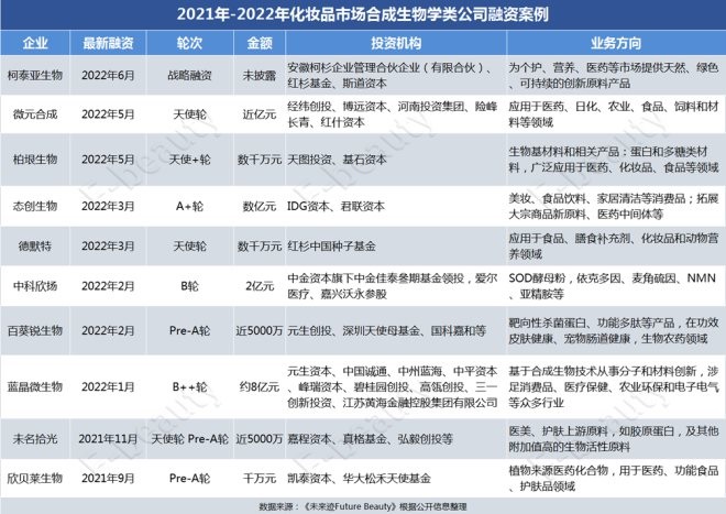 除了6月底被紅杉投資的柯泰亞生物之外,前前后后共有上10家涉足美妝產業(yè)的合成生物公司獲得機構融資,在一級市場占盡風頭。