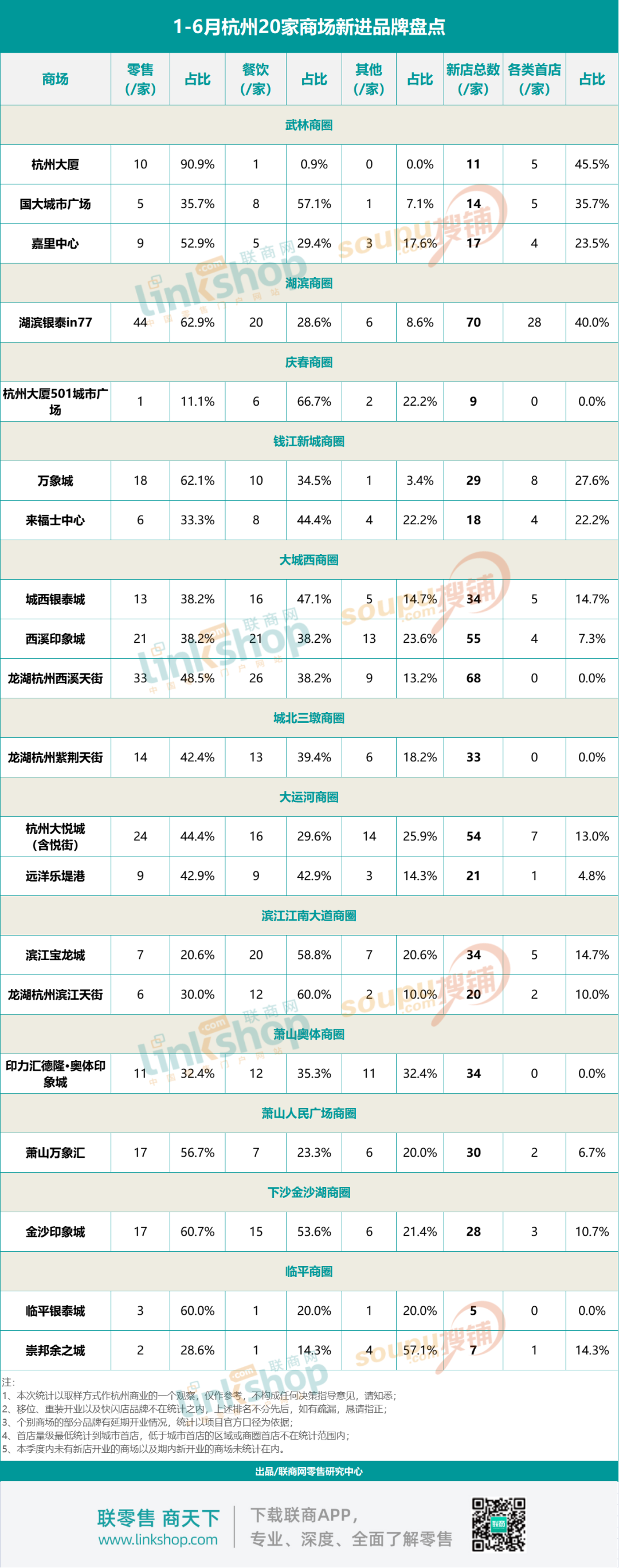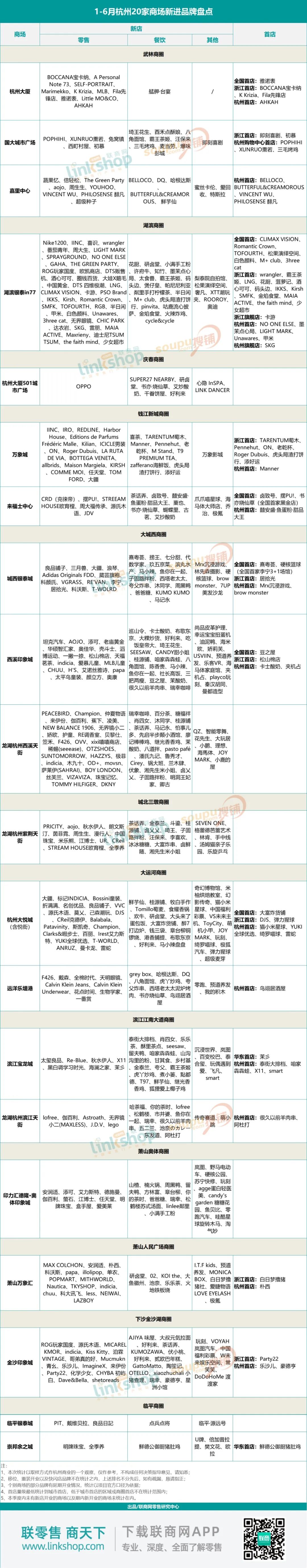 附:1-6月杭州20大商場新店&首店統(tǒng)計
