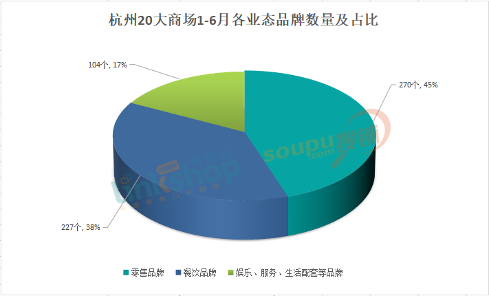 據聯商網零售研究中心監(jiān)測結果顯示,20家重點商場1-6月總計引進新品牌601個,其中,零售品牌270個,約占比45%,餐飲品牌227個,約占比38%,其他業(yè)態(tài)品牌合計104個,約占比17%。