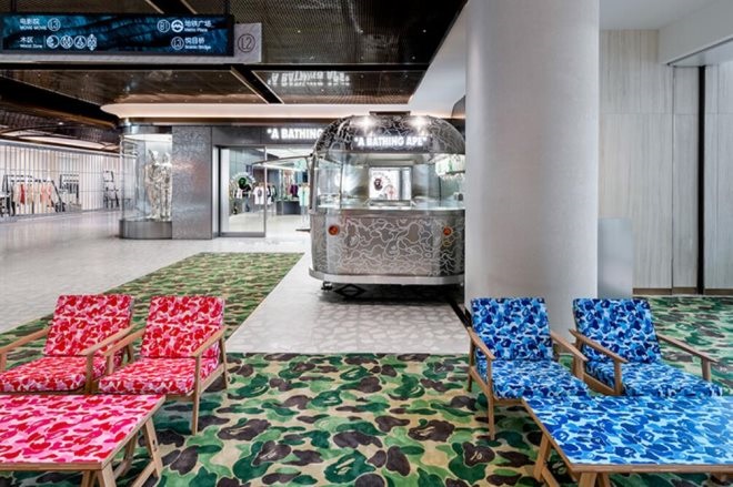 BAPE CAFE!??前灘太古里店打造了開放式社交空間,以露營(yíng)車概念打造的全金屬餐車滿版覆蓋LINE CAMO圖案,休憩區(qū)場(chǎng)景特別鋪設(shè)BAPE? HOME高端木制家具,搭載富有街頭調(diào)性的ABC迷彩圖騰,營(yíng)造出悠閑的空間氛圍。