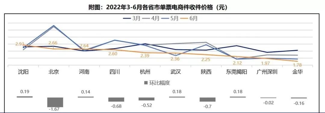 快遞行業(yè)咨詢機(jī)構(gòu)雙壹咨詢《快遞價(jià)格指數(shù)》監(jiān)測(cè)到的數(shù)據(jù)顯示,今年6月全國(guó)多地快遞價(jià)格普遍下降。比如廣州深圳、金華等地,電商件價(jià)格在跌破2元的基礎(chǔ)上再次下跌,價(jià)格戰(zhàn)信號(hào)比較明顯。