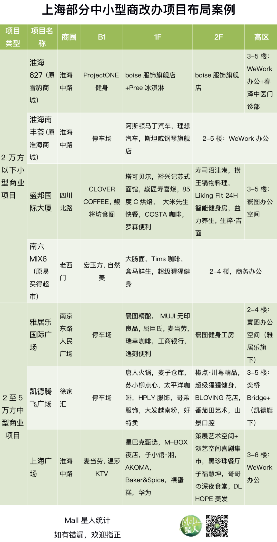 以下是Mall星人整理的上海部分中小型商改辦項目的樓層布局情況,供參考。
