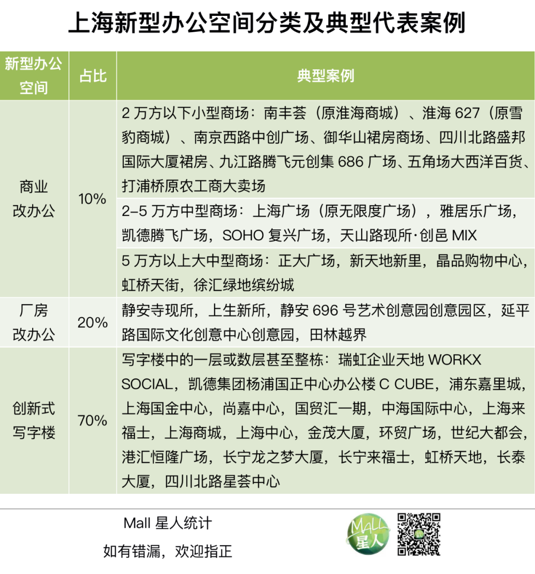 據(jù)Mall星人不完全統(tǒng)計,在創(chuàng)新式寫字樓和廠房(或其他城市建筑)改造而成的創(chuàng)意園區(qū)(多數(shù)為辦公+商業(yè))之外,目前由商場面積轉(zhuǎn)成的新型辦公空間,約占整個新型辦公空間市場的一成。