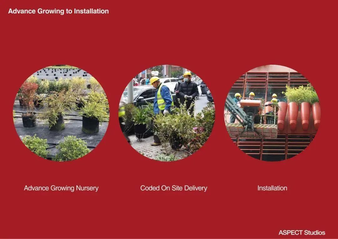 復(fù)合式花盆和噴灌系統(tǒng),在技術(shù)層面給予了植物存活的基本條件。但景觀作為藝術(shù)與技術(shù)的結(jié)合,最終的呈現(xiàn)效果仍由植物決定。
