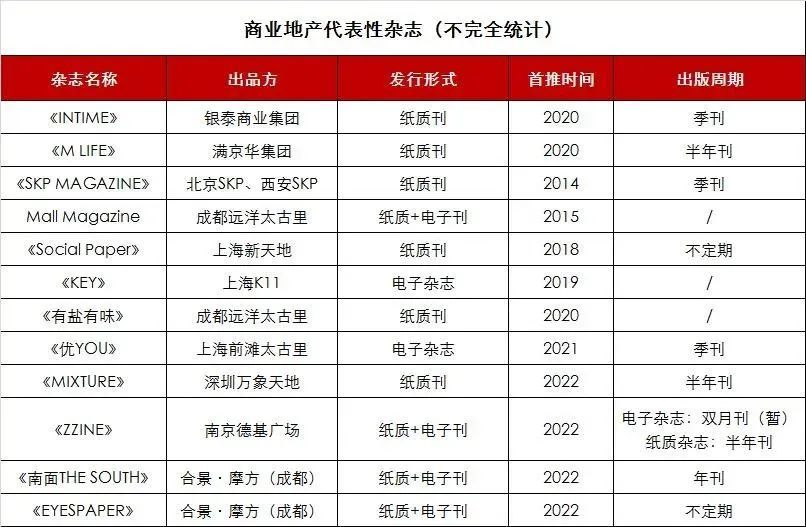 深入分析后發(fā)現(xiàn),率先做雜志的這批購(gòu)物中心多是全國(guó)性的高端商場(chǎng),且大多定位年輕化。