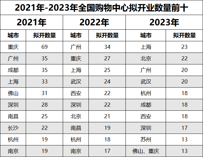 其中,上海擬開業(yè)23個,數(shù)量居國內(nèi)榜首,擬開業(yè)數(shù)量超20個的還有北京、廣州、武漢三個城市。曾在過去兩年上演購物中心開業(yè)熱潮的重慶則是慢下腳步,今年擬開業(yè)數(shù)量為13個。