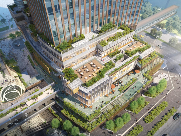 項目由建筑樓高分別為212米的北塔和130米的南塔地標性雙子塔辦公樓造型互相輝映,兩塔樓之間由融合藝術(shù)裝置的南北連橋及下沉廣場相連,配以商業(yè)、藝術(shù)空間、綠化公園等區(qū)內(nèi)規(guī)劃。