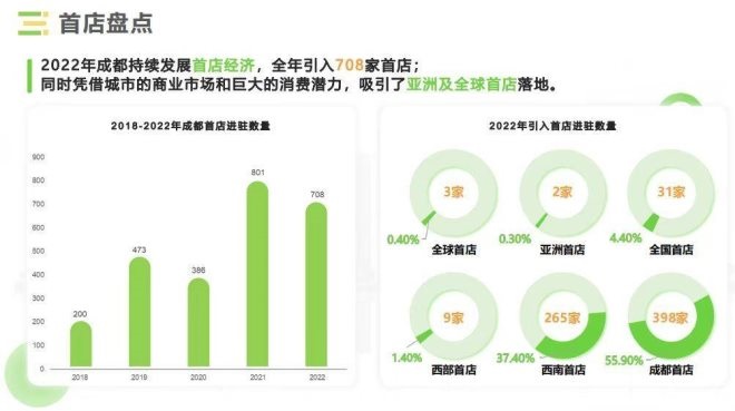 報告顯示,2022年成都持續(xù)發(fā)展首店經(jīng)濟,全年引入708家首店;同時憑借城市的商業(yè)市場和巨大的消費潛力,吸引了亞洲及全球首店落地。