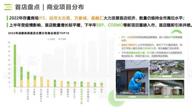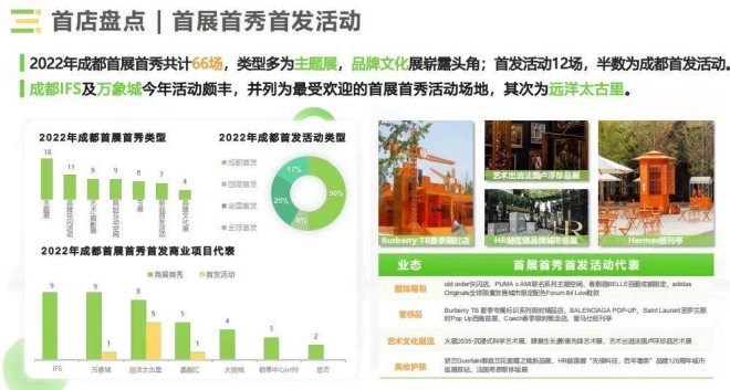 此外,報告顯示,2022年成都首展首秀共計66場,類型多為主題展,品牌文化展嶄露頭角;首發(fā)活動12場,半數(shù)為成都首發(fā)活動。從地點來看,成都IFS及萬象城的活動頗豐,并列為最受歡迎的首展首秀活動場地,其次為遠洋太古里。