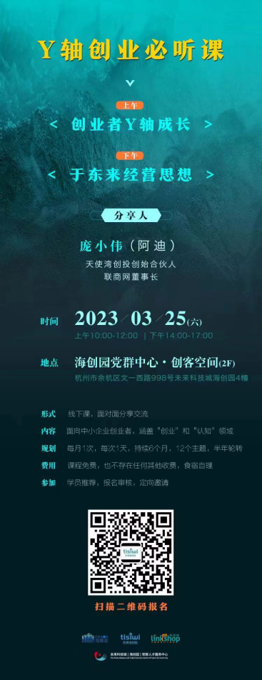 6、Y軸創(chuàng)業(yè)成長課第二次課開課,面向會員免費(fèi)開放。3月25日,由聯(lián)商網(wǎng)董事長龐小偉主講的《2023年Y軸創(chuàng)業(yè)成長公益分享課》(附超鏈接)第二期課程如期舉辦,本次課堂主題分為“創(chuàng)業(yè)者Y軸成長”和“于東來經(jīng)營思想”兩部分。該公益課課程全年共設(shè)12次不同主題課,每月一次,每次一天,課程內(nèi)容主要涵蓋“創(chuàng)業(yè)”和“認(rèn)知”兩個領(lǐng)域。聯(lián)商個人VIP會員均享有免費(fèi)參加的權(quán)益。