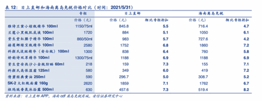 中免免稅與有稅渠道商品比價,來源:安信證券