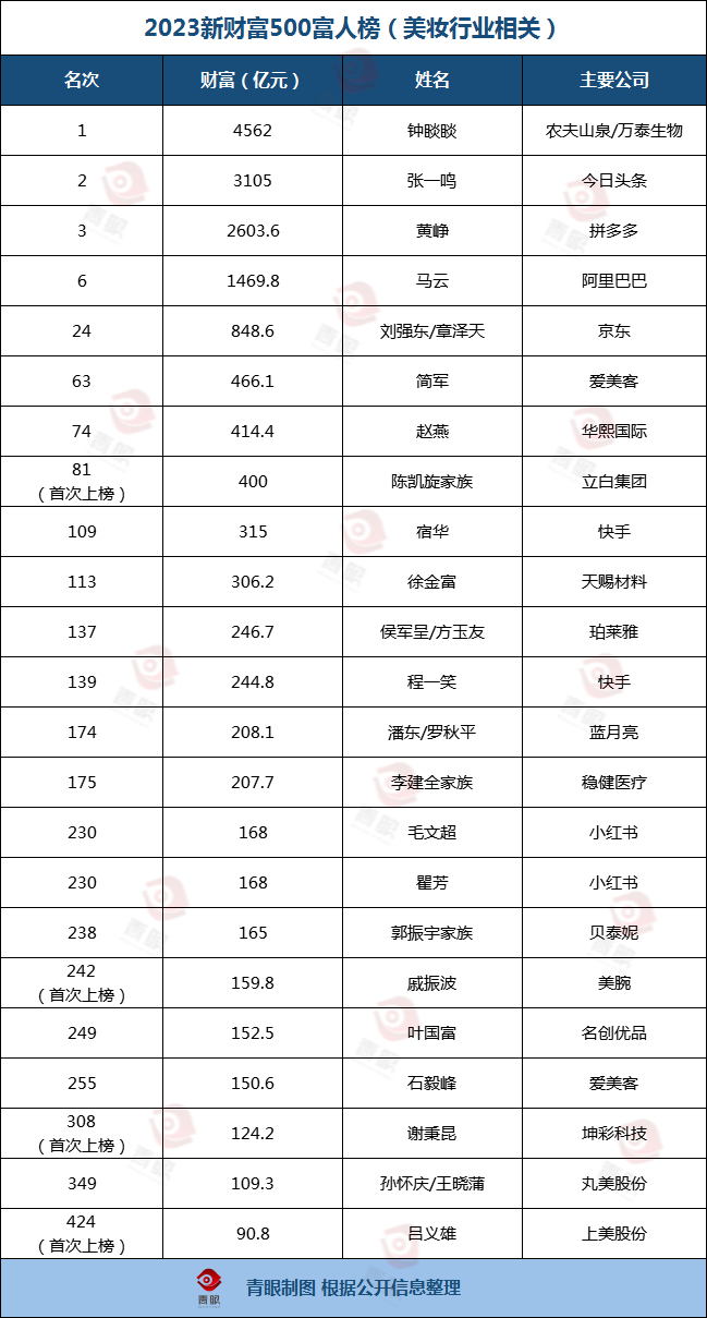 據(jù)青眼梳理統(tǒng)計(jì)發(fā)現(xiàn), 2023 新財(cái)富 500 富人榜中,與美妝行業(yè)相關(guān)的富豪共有 26 人,合計(jì)財(cái)富值達(dá)到了 1.66 萬億元,涉及領(lǐng)域涵蓋了電商平臺(tái)、品牌方、上游原料商、直播電商機(jī)構(gòu)等。