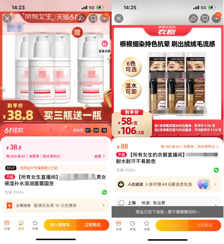 分別截自所有女生直播間(左)、所有女孩衣櫥直播間(右)購物車