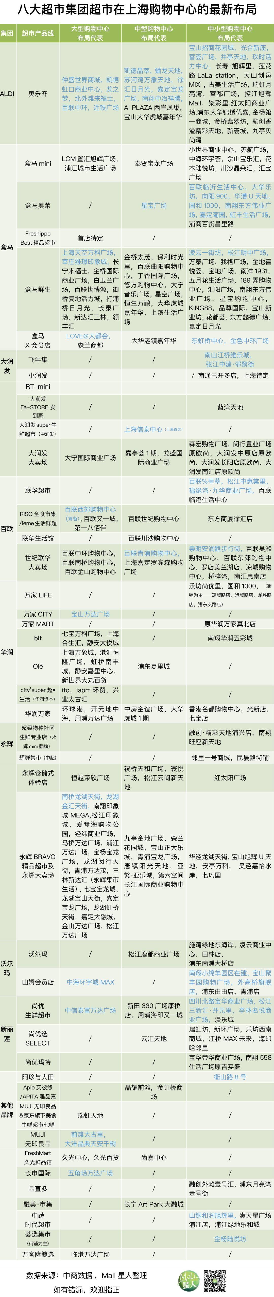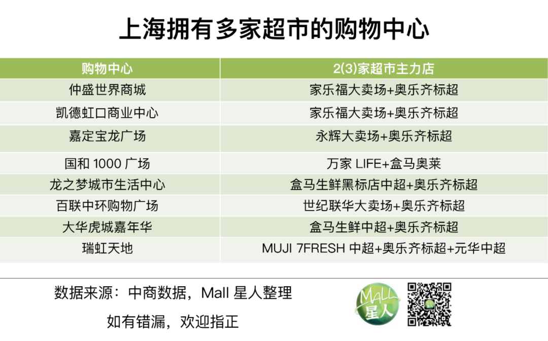 購(gòu)物中心內(nèi)的超市,目前呈現(xiàn)小型化多樣化趨勢(shì)。而與上海頭部購(gòu)物中心(知名商業(yè)集團(tuán))合作最多的標(biāo)超,是奧樂齊(合作伙伴:瑞安、華潤(rùn)、凱德、印力、百聯(lián)、招商蛇口、仲盛、龍之夢(mèng)、旭輝、寶龍)和盒馬mini&盒馬奧萊(合作伙伴:旭輝、寶龍、陸家嘴、百聯(lián)、中海)。