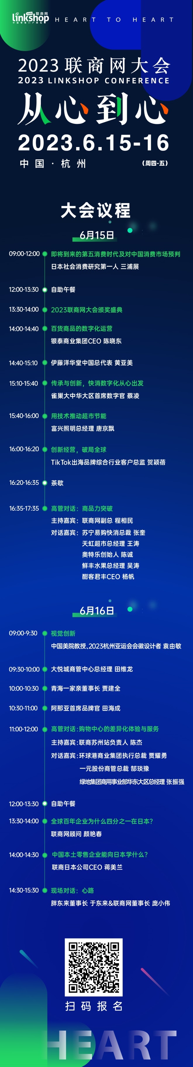 6月15日-16日,2023聯(lián)商網(wǎng)大會(huì)將于杭州良渚洲際酒店盛大啟幕,本次會(huì)議我們將與四海賓朋來(lái)一場(chǎng)心與心的探討。日前,大會(huì)議程已經(jīng)出爐,數(shù)十位參會(huì)重磅嘉賓也已敲定。關(guān)于本次大會(huì),有哪些亮點(diǎn)、看點(diǎn)、突破點(diǎn)值得大家期待?我們先行梳理了一份,一起來(lái)看下: