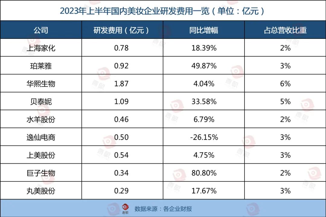不可忽視的是,上述企業(yè)之所以成為市場的領(lǐng)跑者,與其近年來抓住了行業(yè)發(fā)展趨勢關(guān)系密切。眾所周知,今年以來,國貨護(hù)膚領(lǐng)域掀起了一股“中國成分”風(fēng)潮。這一方面說明國貨美妝的崛起,另一方面也說明不論是消費(fèi)端還是企業(yè)端,研發(fā)越來越成為頭部企業(yè)的立身之本。輕研發(fā)重營銷的時(shí)代早已過去,要想成為真正的頭部企業(yè),研發(fā)投入必將成為重中之重。