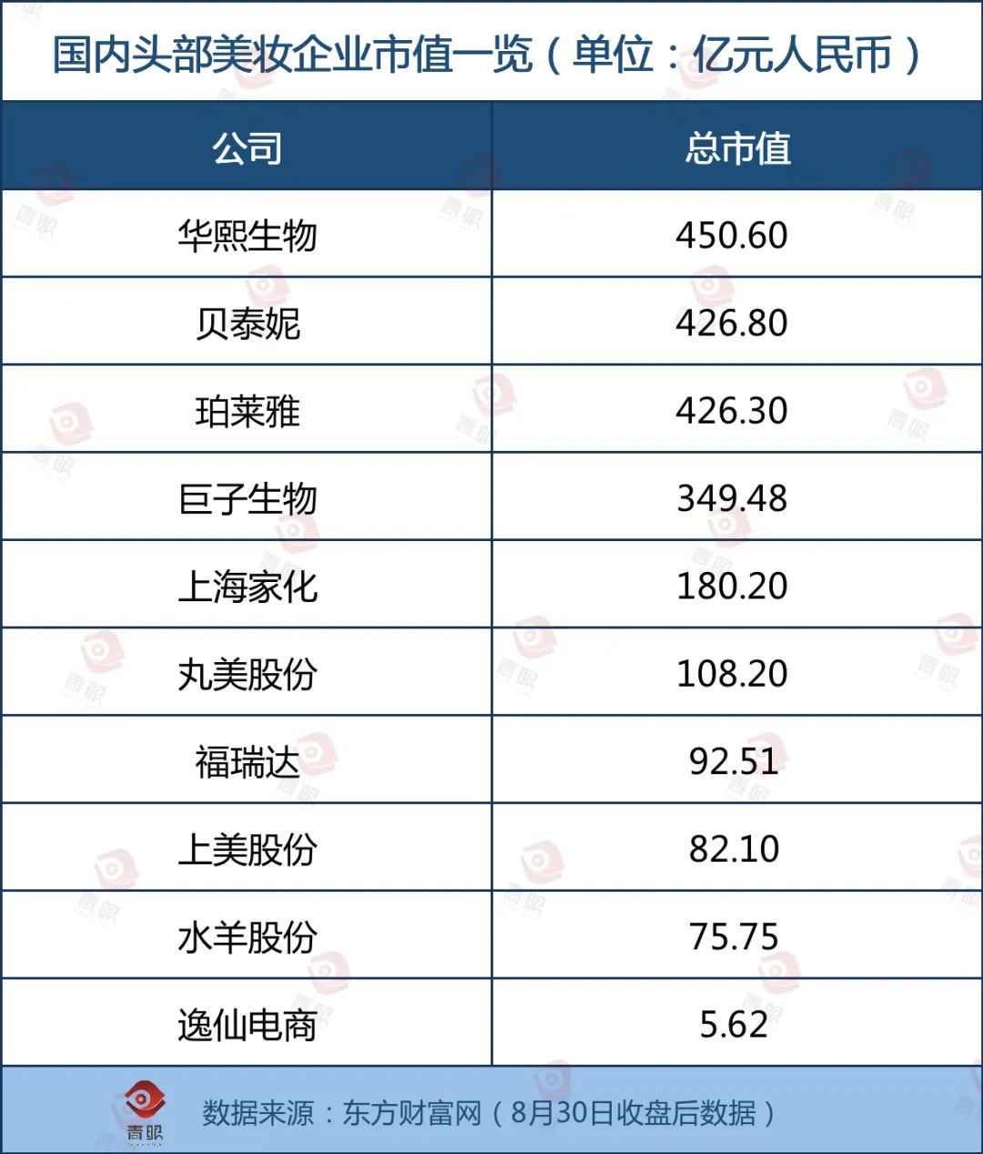 可以說,在化妝品零售市場增長放緩的當(dāng)下,頭部企業(yè)們正在以自己的方式尋求增量。截至今日收盤,華熙生物、貝泰妮、珀萊雅和巨子生物仍位列頭部企業(yè)市值的第一梯隊(duì),其中華熙生物市值居首位,為450.6億元。