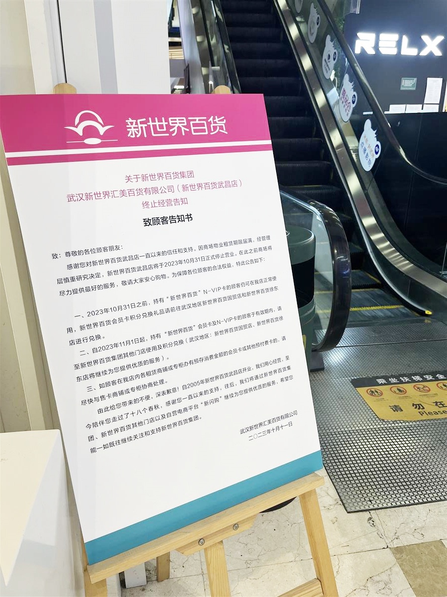 據(jù)《致顧客告知書》顯示,因商場物業(yè)租賃期限屆滿,經(jīng)管理層慎重研究決定,新世界百貨武昌店將于2023年10月31日正式停止?fàn)I業(yè)。2023年10月31日之前,持有“新世界百貨”N-VIP卡的顧客仍可在店內(nèi)正常使用,新世界百貨會員卡積分兌換禮品請前往武漢地區(qū)新世界百貨國貿(mào)店和新世界百貨徐東店進(jìn)行兌換。