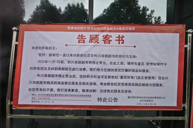 10月10日,重百新世紀(jì)百貨利川商都發(fā)布了一則告顧客書,宣布從2023年11月21日起,利川商都將停止?fàn)I業(yè)。