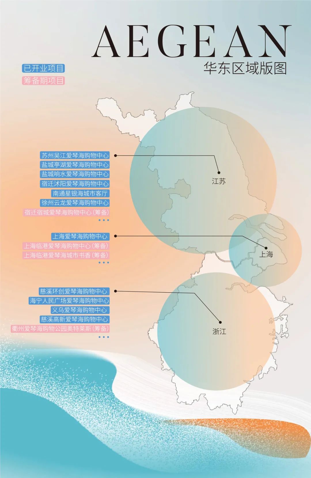 據(jù)悉,愛琴海新成立的華東區(qū)域管轄范圍內(nèi),目前現(xiàn)有管理項(xiàng)目共計(jì)24個(gè),包含運(yùn)營期項(xiàng)目11個(gè)。項(xiàng)目以一二線城市上海、蘇州、無錫等為核心,覆蓋周邊衛(wèi)星城市溫州、慈溪、海寧、義烏、衢州、鹽城、徐州、南通、宿遷等,共計(jì)布局16座城市。其中今年新開業(yè)項(xiàng)目3家,分別為鹽城響水愛琴海購物中心、徐州云龍愛琴海購物中心和12月開業(yè)的衢州愛琴海購物公園奧特萊斯,以及未來即將開業(yè)的上海臨港城市書香、上海臨港愛琴海購物中心、宿遷宿城愛琴海購物中心等項(xiàng)目。