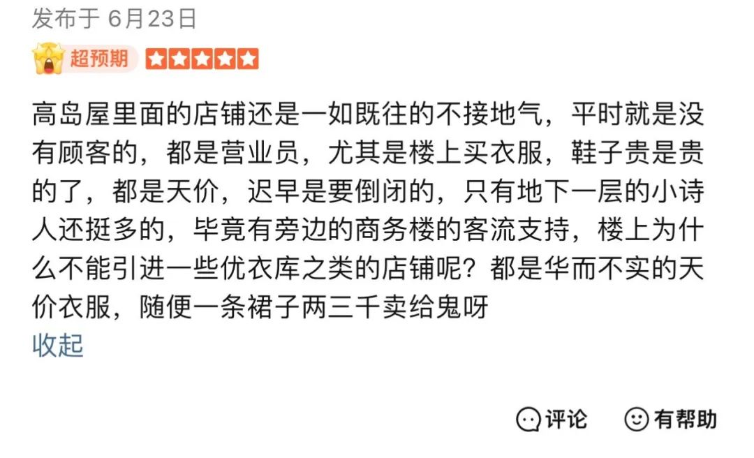 然而,90年代的潮流代表,在今天的網(wǎng)友的眼里,已經(jīng)成了賣“陳年舊貨”的老商場。實際上2010年梅隴鎮(zhèn)伊勢丹已經(jīng)進行過一輪翻新改造,但在新一代消費者眼里,不接地氣的日系品牌,傳統(tǒng)的商場布局,都顯得老氣且沒有新意。網(wǎng)友拍攝的視頻顯示,早在梅隴鎮(zhèn)伊勢丹宣布關(guān)店前的幾個月,這家高端百貨商場,已經(jīng)門可羅雀。過去小有名氣的日式冰淇淋店如今也不如滿記甜品排隊的人多了。