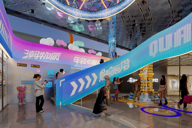 商場(chǎng)樓層布置上,定期更換的藝術(shù)美陳,并一應(yīng)俱全地滿足消費(fèi)者“逛吃”購(gòu)買(mǎi)和打卡拍照的需求,進(jìn)一步達(dá)成“二次元+零售+美食+潮玩”的跨界合作。