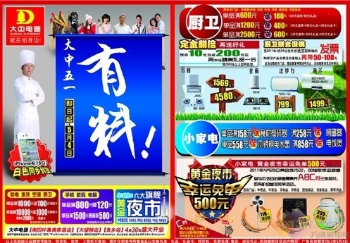 在五一期間大中電器即推出“大中五一 有料”的家電特賣會(huì)。回答期間,大中電器不但推出眾多低價(jià)家電供消費(fèi)者選購,大中電器還將進(jìn)行iphone 4白色同步到貨的特賣會(huì)。
