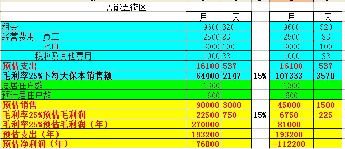 2、營業(yè)額:按已經(jīng)入住600戶計算,初期營業(yè)額1400-2500左右。你按照1500估計吧。