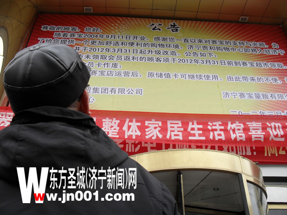 2012年3月18日,賽寶超市門前張貼出一張公告。在濟(jì)寧闖蕩了6年半的賽寶超市被貴和購物中心接手,目前正在進(jìn)行清貨處理。供貨商、顧客面對(duì)突如其來的“并購”一臉驚愕,隨后便開始了一場(chǎng)“搶貨”行動(dòng)。記者采訪發(fā)現(xiàn),管理上暫時(shí)的真空是導(dǎo)致購物潮的直接原因,而若深究賽寶“易主”背后的原因,則與管理制度及經(jīng)營理念有關(guān)。