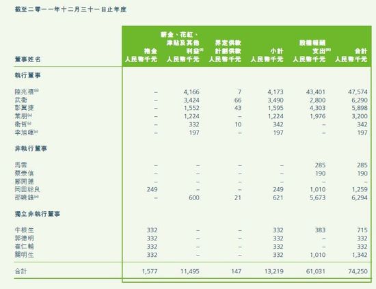 文件同時(shí)顯示,阿里巴巴CFO武衛(wèi)年薪及花紅為342.4萬元,股權(quán)報(bào)酬支出280萬元,總共獲利629萬元;阿里巴巴公司執(zhí)行董事兼副總裁彭翼捷年薪及花紅342.4萬元,股權(quán)報(bào)酬支出430萬元,總獲利589.8萬元;阿里巴巴中國事業(yè)部總經(jīng)理葉朋年薪及花紅為122.4萬元,股權(quán)報(bào)酬支出197.6萬元,總計(jì)320萬元;阿里巴巴前CEO衛(wèi)哲年薪及花紅為33.2萬元,阿里巴巴首席運(yùn)營官李旭暉年薪及分紅19.7萬元。上述四人和陸兆禧為阿里巴巴五位最高薪酬人士。