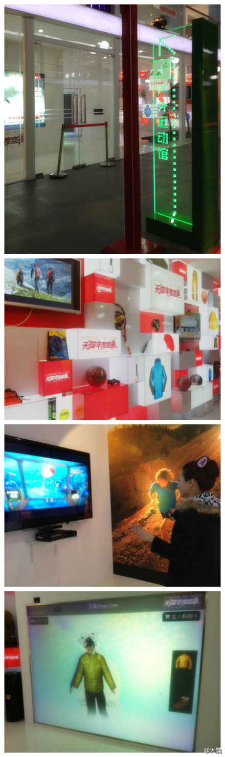 天貓年度盛典之未來購(gòu)物,第二站【戶外運(yùn)動(dòng)館】,非運(yùn)動(dòng)、不生活,只要在屏幕前擺動(dòng)身體,系統(tǒng)就會(huì)自動(dòng)為你換上運(yùn)動(dòng)裝備,置身于各種不同的戶外場(chǎng)景,森林、雪山、溪 流......小心哦,北極熊還會(huì)從身后過來抱你哦。