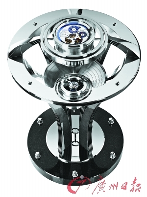 這個套裝包括一枚規(guī)范式指針雙時區(qū)計時表以及一座大型規(guī)范式指針航海鐘,后者除顯示三地時間外,并擁有世界時間顯示功能。計時表以規(guī)范式指針表盤布局亮相,與傳統(tǒng)三針一線規(guī)范式指針時計有所不同,令航海人員清楚知道原來出發(fā)港口的時間,以及現時所處位置的時間,即同時顯示兩個地方的時間。航海鐘高93厘米,直徑56厘米,重120公斤。航海鐘只是套裝的一半,所以其中一條支柱上有一個小型萬向接頭懸掛支架,用來放置航海計時表,就算海上波濤有多洶涌,懸掛支架亦始終保持水平狀態(tài),令計時表免受地心吸力影響導致誤差。