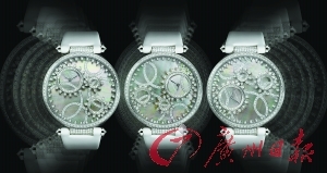 在裝飾漩渦圖案的大溪地珍珠母貝底盤上,三枚鑲嵌明亮式切割鉆石的圓環(huán)在齒輪的驅動下翩翩起舞,指示時間的小巧表盤在主表盤中不停旋轉,營造出令人目眩神迷的機械之美……腕表底盤上,一幕現代芭蕾舞劇正在上演。寶石的光芒在齒輪間躍動,轉眼又落在表冠上。這款新穎獨特的腕表讓源自于珠寶設計的奇思妙想,在寶石的光芒下熠熠生輝,與時光盡情嬉戲。