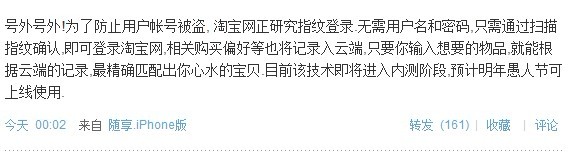 淘寶網(wǎng)微博稱(chēng):號(hào)外號(hào)外!為了防止用戶(hù)帳號(hào)被盜,淘寶網(wǎng)正研究指紋登錄。無(wú)需用戶(hù)名和密碼,只需通過(guò)掃描指紋確認(rèn),即可登錄淘寶網(wǎng),相關(guān)購(gòu)買(mǎi)偏好等也將記錄入云端,只要你輸入想要的物品,就能根據(jù)云端的記錄,最精確匹配出你心水的寶貝.目前該技術(shù)即將進(jìn)入內(nèi)測(cè)階段,預(yù)計(jì)明年愚人節(jié)可上線使用。