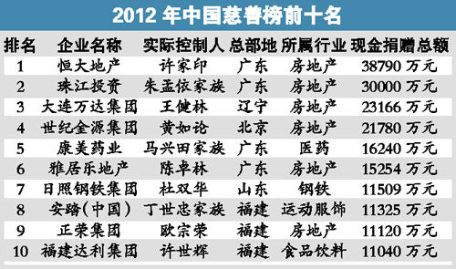 榜單顯示,2011年捐贈(zèng)過(guò)億元的企業(yè)家達(dá)13位。在前20名中,主要從事房地產(chǎn)的企業(yè)達(dá)到10家,占到一半。福布斯表示,目前,民政部尚未發(fā)布“2011年民政事業(yè)發(fā)展統(tǒng)計(jì)報(bào)告”,但根據(jù)其發(fā)布的2011年1~4季度全國(guó)民政事業(yè)統(tǒng)計(jì)累加,2011年的社會(huì)捐款總數(shù)為145.2億元,僅為2010年的37%。