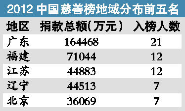 數(shù)據(jù)顯示,廣東、福建、江蘇、遼寧、北京是入榜人數(shù)最多的5個(gè)地區(qū),其上榜人數(shù)占到總數(shù)的59%,捐款總額占總捐款額的75%,是主力捐款地區(qū)。其中,廣東有21名富豪入榜,捐款總額為16.4億元。