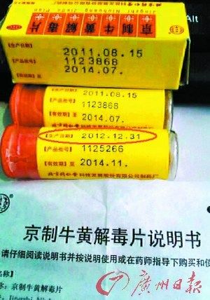 近日,有市民在微博上報(bào)料稱:“幾天前在員村三橫路140公交站旁某藥房買北京同仁堂牛黃解毒片,今天我準(zhǔn)備吃藥才發(fā)現(xiàn)藥瓶上的生產(chǎn)日期是2012年12月31日,它不是藥,是穿越回來帶我走的吧?”
