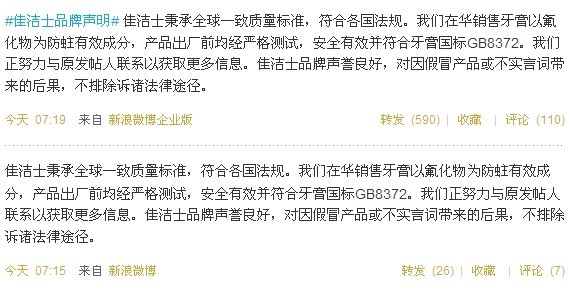 佳潔士牙膏被指“不含氟”官方稱系謠言 聯(lián)商網(wǎng)消息:近日有網(wǎng)友爆料稱,國內(nèi)佳潔士牙膏里沒有氟的成份,盡是工業(yè)廢料。對此,佳潔士Crest 官方微博今日回應稱,佳潔士在華銷售牙膏以氟化物為防蛀有效成分,安全有效并符合牙膏國標GB8372。“真金不怕火煉,謠言止于智者,佳潔士感謝廣大消費者的信任,并歡迎大家的監(jiān)督!”