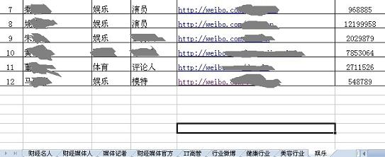 BiaNews還獲得另外一份微博資源表,其中不乏一線明星、業(yè)內(nèi)專家、企業(yè)高管,上述業(yè)內(nèi)人士表示,這些名人帳號基本都是和娛樂公司合作,不過由于報價高、客戶少,今年就沒再向客戶介紹這些資源。