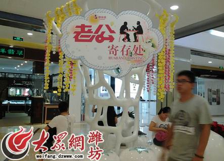 5月28日,記者來到濰坊某大型商場,看到一樓大廳處設有“老公寄存處”,引來不少前來購物的人圍觀休息。