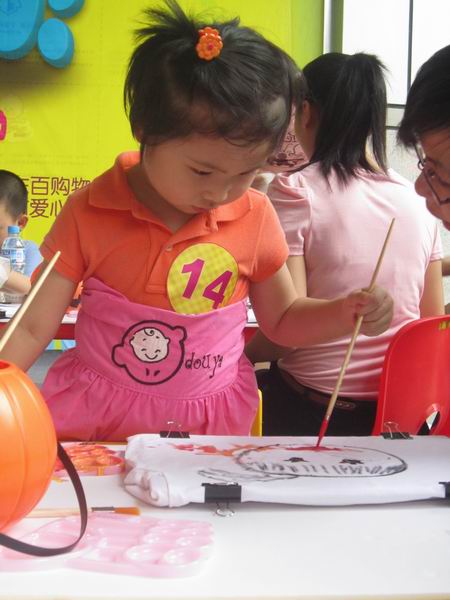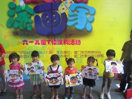 活動(dòng)當(dāng)天小朋友早早的到達(dá)活動(dòng)現(xiàn)場(chǎng),瞬間東百門口充滿了孩子們的歡聲笑語(yǔ)。本次活動(dòng)也在小朋友們陸續(xù)到達(dá)后開(kāi)始了;顒(dòng)中請(qǐng)到了廈門愛(ài)心培訓(xùn)學(xué)校的老師,在老師生動(dòng)的描述中,小朋友抓住自己的外貌特征,儼然就像一個(gè)小畫(huà)家,一筆一畫(huà)在T恤上將自己的樣子畫(huà)下來(lái)。在白色的T恤上,畫(huà)滿了喜歡的五顏六色。面對(duì)畫(huà)好后掛著的一件件T恤,大家對(duì)每一幅小作品都贊不絕口,每一幅也各有千秋!經(jīng)過(guò)老師的一番點(diǎn)評(píng),隨著最佳創(chuàng)意獎(jiǎng)、最佳色彩獎(jiǎng)、最佳繪畫(huà)獎(jiǎng)的揭曉,東百歡樂(lè)六一第一場(chǎng)活動(dòng)結(jié)束了。