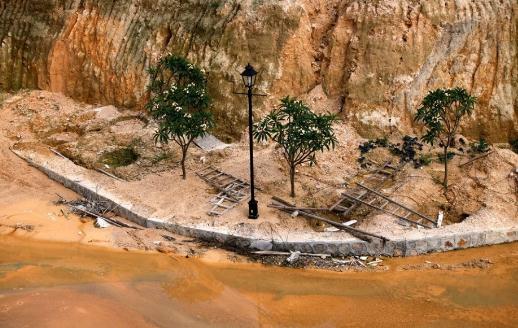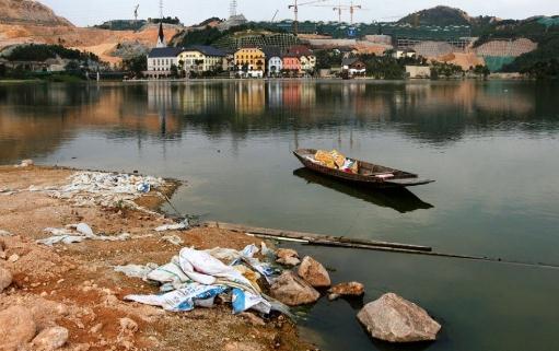 一名清潔工在打掃小鎮(zhèn)的街道。據(jù)當(dāng)?shù)卮迕窠榻B,前幾年這里水草豐茂,有很多未被開發(fā)利用的小水塘和濕地,草長(zhǎng)鶯飛,風(fēng)景秀美,是一塊原生態(tài)的凈土。而隨著開發(fā)商五礦建設(shè)進(jìn)入后,這里的秀美風(fēng)景便發(fā)生了變化。