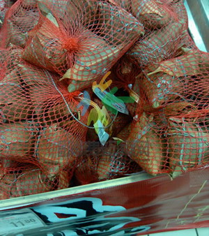 記者看到嘉興市南湖齋食品有限公司生產(chǎn)的“紅船”牌125克*6肉粽,是由網(wǎng)袋包裝著的,除此之外粽子外表并沒(méi)有其他包裝措施,在網(wǎng)袋的標(biāo)簽上分明寫著生產(chǎn)日期為2012年6月1號(hào),根據(jù)其中標(biāo)注的儲(chǔ)存方式,常溫下位5天,0-4°為10天,-18°為18個(gè)月,而超市售賣時(shí)是將其置于常溫之下,并沒(méi)有任何冷藏措施。